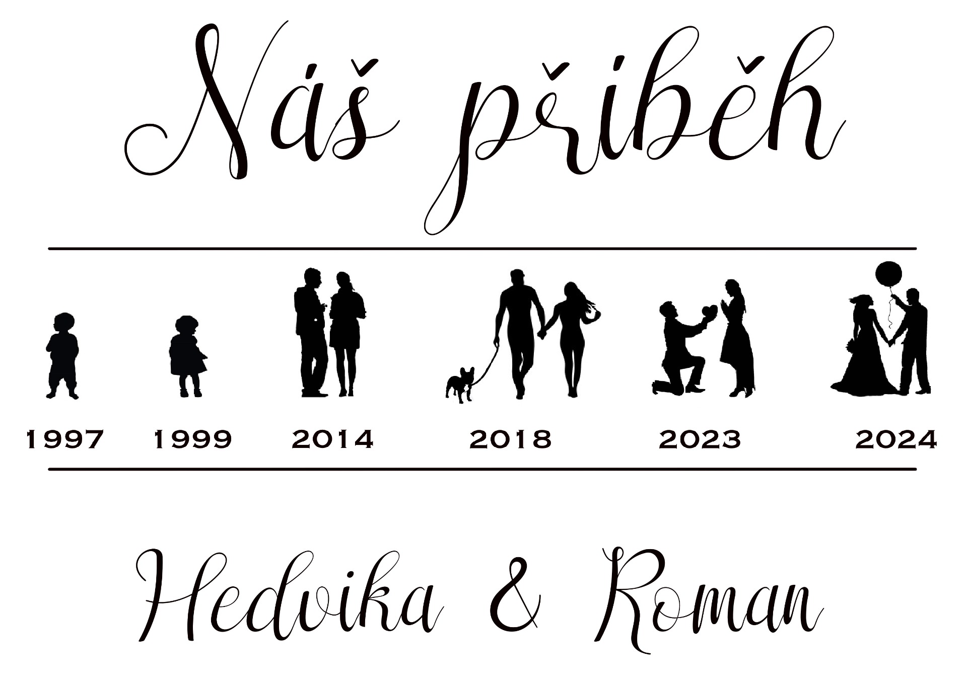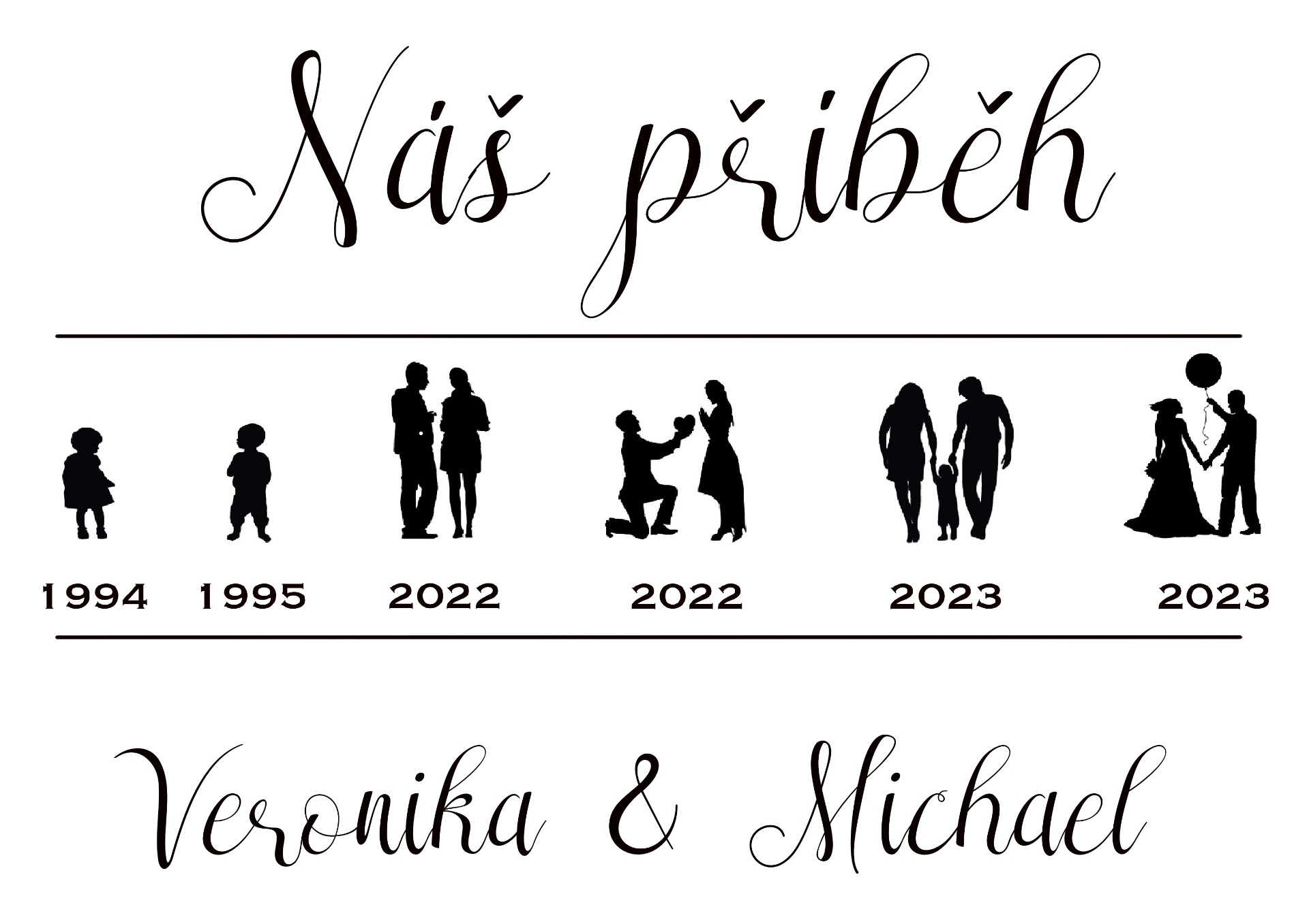 Tato časová osa zachycuje příběh života novomanželů v přehledné a estetické formě. Zobrazuje důležité okamžiky, jako je seznámení, zasnoubení a další milníky jejich společného života. Perfektní a osobní dárek pro svatební den nebo jako jedinečná dekorace do domácnosti novomanželů.